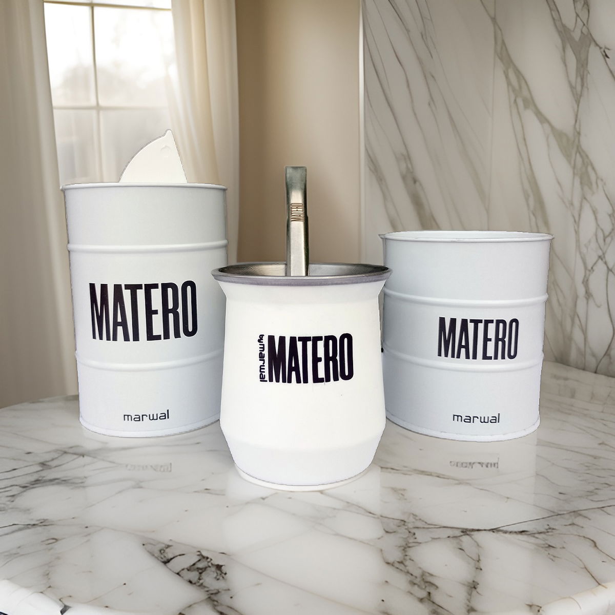 Juego Vertedores + Mate + Bombilla. Linea Matero Blanco
