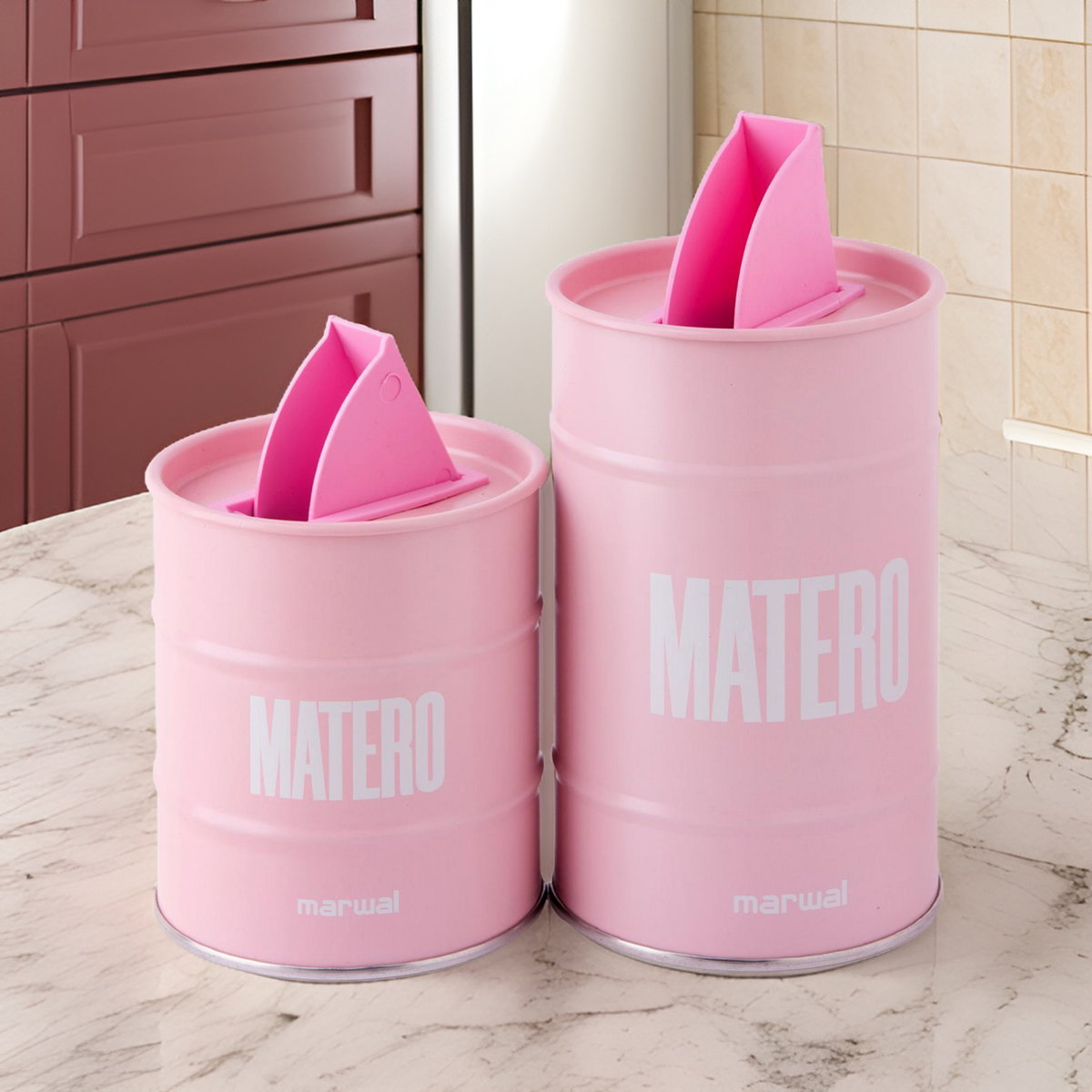 Juego de latas, yerbera y azucarera con pico plástico.