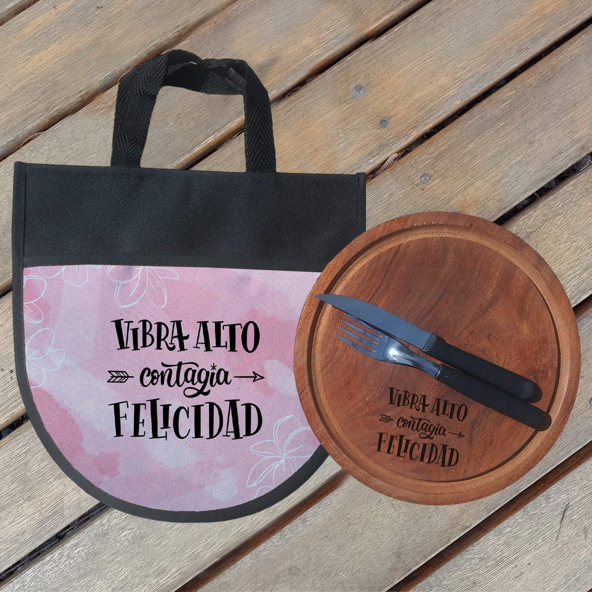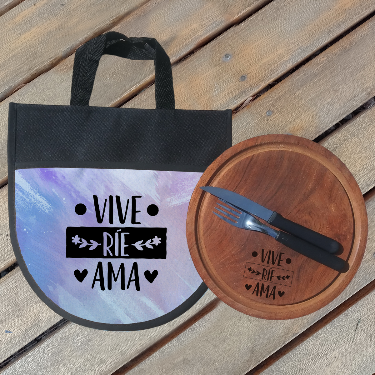 Combo 5 : Funda - Plato Algarrobo (con grabado laser) - Cubiertos
